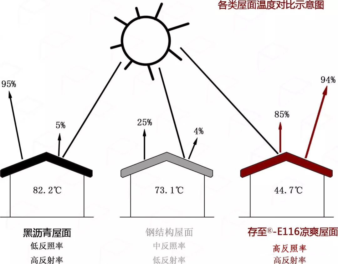 這種能使被涂覆建筑在太陽光照射下產(chǎn)生降溫效果的隔熱涂料引起了廣泛的關(guān)注,市場上出現(xiàn)了各類太陽熱反射隔熱涂料、熱反射隔熱保溫涂料、防水防腐隔熱保溫涂料、節(jié)能保溫隔熱涂料,促使建筑屋頂屋面、墻體節(jié)能。提倡建筑節(jié)能,發(fā)展綠色房屋建筑、促進建筑節(jié)能已經(jīng)成為我國節(jié)能減排戰(zhàn)略的重要組成部分。其中,存至®-E116隔熱降溫系統(tǒng)因其隔熱降溫效果顯著,熱反射率高,涂層質(zhì)量輕、耐久性好、施工方便、易于維護等特點受到了更為廣泛的關(guān)注。
