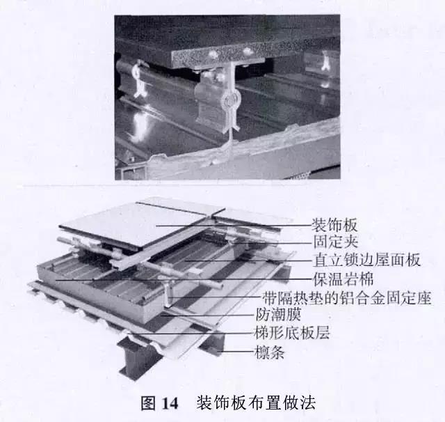 裝飾板系統的連接固定,無需在鋁鎂錳合金板上開洞;兩層板之間的開放式連接,無需維護,并可降低清理要求;可調節系統使裝飾板可完美布置,裝飾板布置做法見圖14。